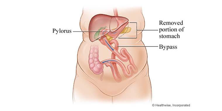 The pylorus, which controls food drainage from the stomach, is connected to a lower segment of the intestine. The duodenum is connected to the lower part of the small intestine. The food you eat then bypasses much of the small intestine. This results in fewer calories absorbed and weight loss.